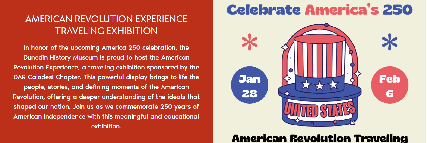 In honor of the upcoming America 250 celebration, the Dunedin History Museum is proud to host the American Revolution Experience, sponsored by the DAR Caladesi Chapter. The display brings life to the people, stories and defining moments fo the American Revolution.